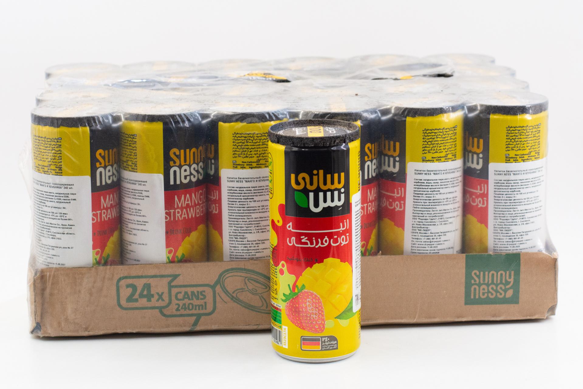 Напиток безалкогольный сокосодержащий Sunny Ness Манго и клубника (Иран) 240мл ж/б62,35 руб. за штуку (в упак. 24 шт.) |